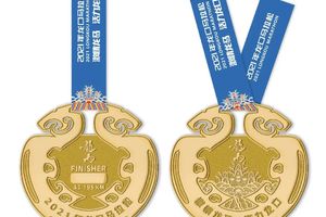 灵感源自寓意美满的双龙玉环,龙口原名黄县后改名为龙口,同时本次龙口马拉松全程与半程奖牌为纯黄铜精致(迷你马奖牌为锌合金奖牌),双重寓意故称为:黄龙奖牌。