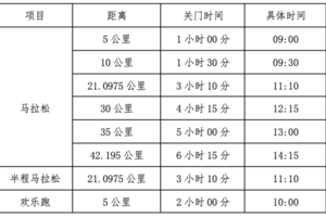 九江赛城湖马拉松各项目关门时间按自然时间计算,具体见下表: