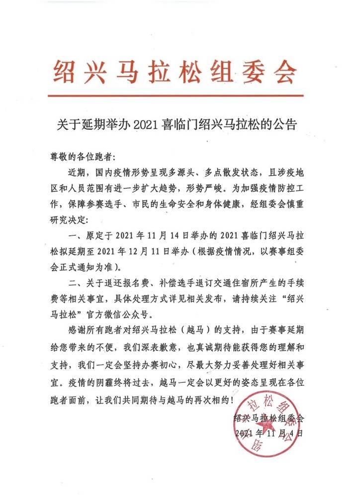 11月4日,绍兴马拉松组委会发布公告,因近期国内疫情形势,为加强疫情防控工作,保障参赛选手、市民的生命安全和身体健康,经组委会慎重研究决定: