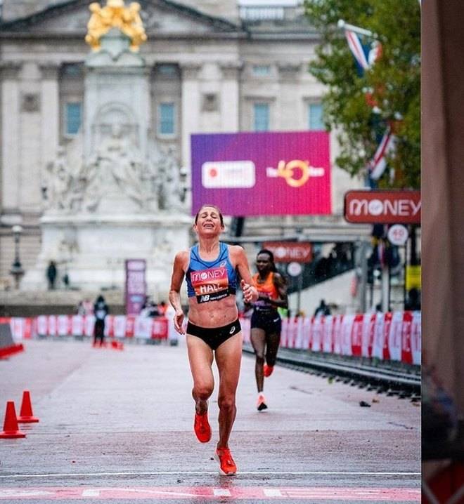 全长1.3英里的赛道跑到第9圈的时候,Sara Hall将她的手表扔给了丈夫Ryan。她现在目之所及的地方,看不到任何一个女选手。这是2020年的伦敦马拉松,她现在落后领先集团大概1分钟,在她身后的人群差她45秒。她现在已经没有心思去查看自己的分段配速了。